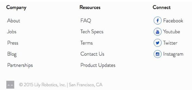 百合相機(jī)的網(wǎng)站頁腳具有許多信任信號,所有信息都匯集在一起,以確保潛在客戶和客戶,公司背后是100%的板上。它具有指向其“關(guān)于”頁面,聯(lián)系人電子郵件地址和社交媒體按鈕的鏈接,所有這些都彼此靠近。