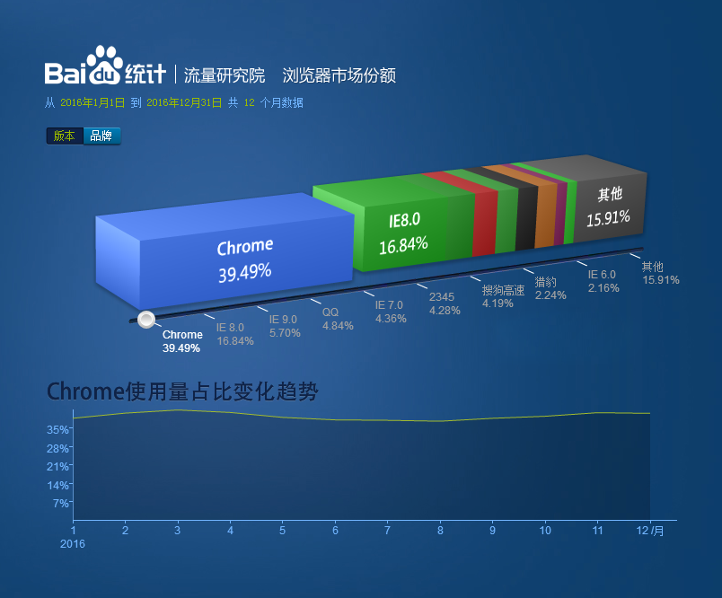 網(wǎng)站設(shè)計是個很大的學(xué)問。很多朋友以為不了解現(xiàn)今用戶的使用習(xí)慣及使用設(shè)備情況,而導(dǎo)致真多設(shè)計以不符合使用需求而流失了很多客戶,那么今天創(chuàng)新互聯(lián)就來給大家分享下,2016整年度的用戶瀏覽器及設(shè)備使用情況。關(guān)于這些市場數(shù)據(jù),不管是產(chǎn)品、策劃、設(shè)計師,還是前端和開發(fā)都是必須了解和掌握的。好吧,接下來一起看數(shù)據(jù)吧。
