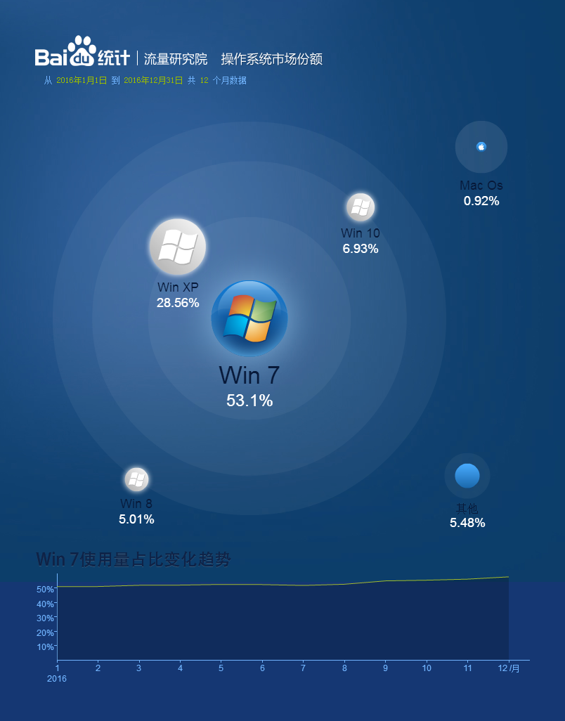 win7其實真的很好用,小編用過win10后,因為各種問題還是將系統(tǒng)重新裝回 win7,而win8一直是個悲劇,使用效果非常不理想,這小編也是深有體會,那么他占5.01%也屬正常,不過無論是win7、win8、還是win10均已能支持IE9以上瀏覽器,說明H5時代已經(jīng)完全開啟。