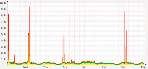 圖1為2019年7月30日至8月6日的權威DNS流量圖,其中高峰為攻擊發生流量,可以看到這一周的工作日經常發生攻擊。