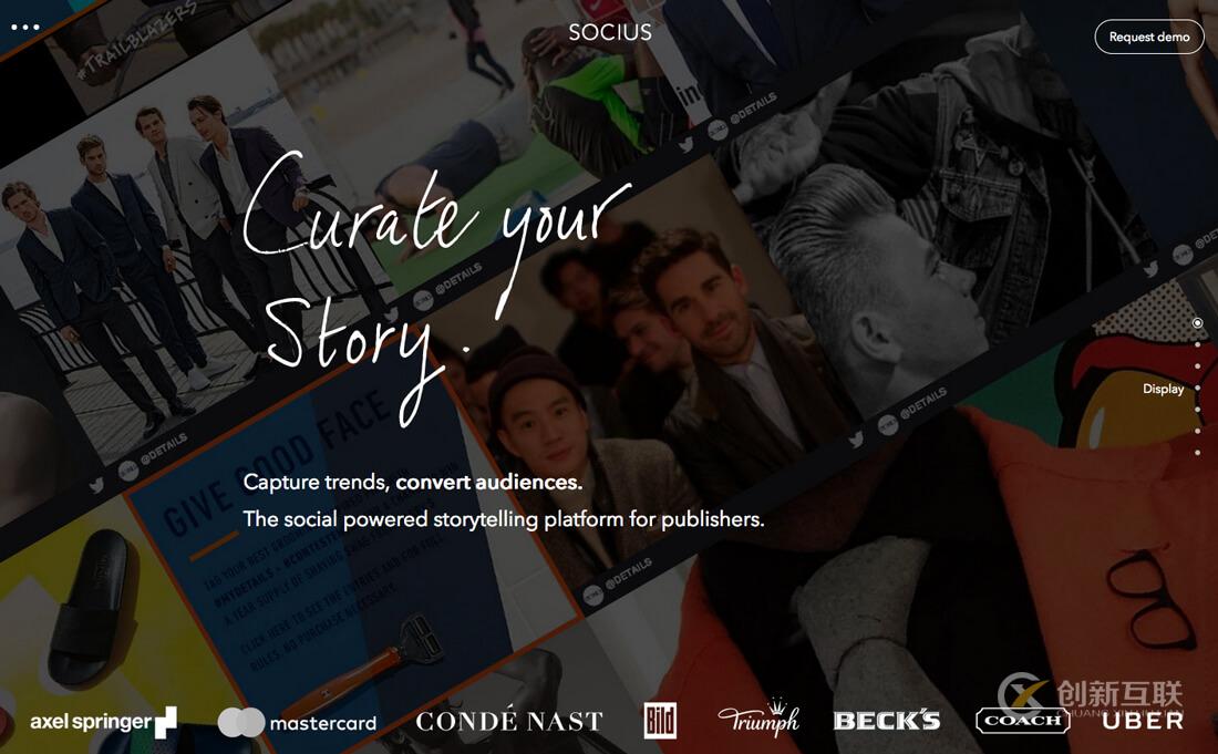 在上面的socius 頁面的右側,使用了許多同類網站都采用的小圓點來作為視覺標識,當光標懸停在小圓點上的時候,會有信息浮現,告訴用戶這些區域的內容。同樣的,用戶可以通過點擊這些小圓點快速跳轉到特定的區域。