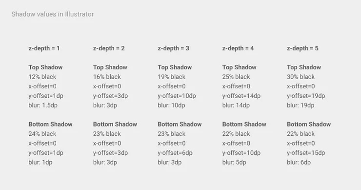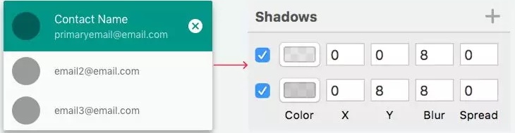 第一種投影的類型,即光源從元素的上方投射下來,可以參考谷歌提供的投影方案疊加兩層投影。第一層是 XY 軸坐標為0,只添加模糊的參數(shù),透明度較低。第二層陰影使用相同的模糊參數(shù),增加 Y 軸坐標,透明度較高。