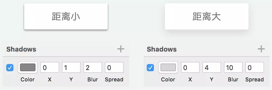 一般的設(shè)計軟件中,元素的陰影即是在元素的背后添加了一個相同輪廓的純色矢量圖形,我們可以通過 XY 軸移動它的位置,并使用模糊的參數(shù)來設(shè)置它的模糊度。當元素的距離水平面越近,陰影距離元素也就越近,即 XY 軸越小,模糊也越小,如果離得遠則相反。
