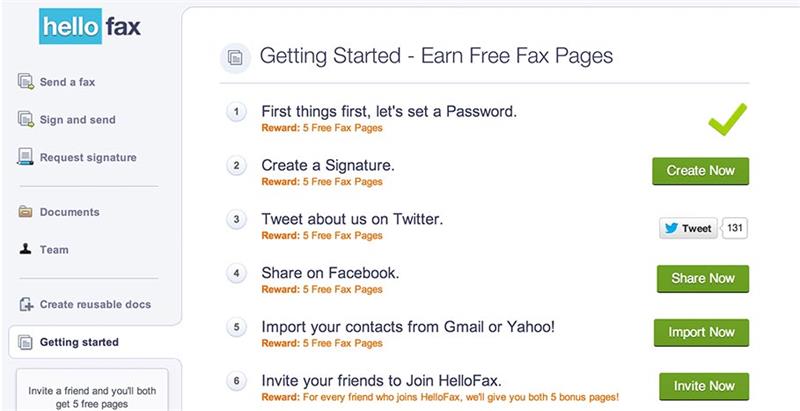 就像那些一上來就提供面包的餐館,HelloFax很巧妙地讓人們決定采用他們家的服務。他們在用戶完成注冊之后,還提供了一系列任務,每完成一個獎勵5個傳真額度。雖然注冊只需要一個郵箱地址,但設置密碼甚至都可以賺取任務獎勵額度。在這個賺取額度的過程中,你和這個工具就有了共同經歷。