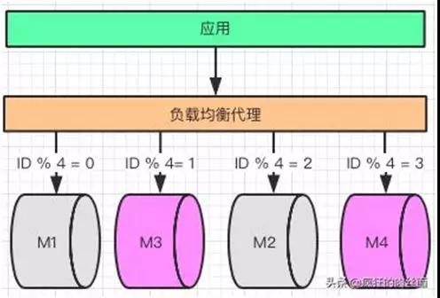 當完成數據同步之后,四個庫的數據保持一致了,修改負載均衡代理的配置為 ID%4 的模式。此時擴容就完成了,從原來的 2 個數據庫擴展成 4 個數據庫。