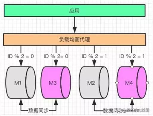 需要對目前的兩個數據庫做擴容,擴容之后是 4 個庫如下圖。新增的庫是 M3,M4 路由的方式分別是 ID%2=0 和 ID%2=1。