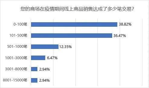 根據商業地產數字化研習社在2.18-2.21四天時間內對186家商場所做的調研顯示,疫情期間,有91%(170家)的商場都開展了各種形式的線上銷售活動,其中有20家店鋪以上參與銷售的商場占比55.24%(94家),通過采取各種線上銷售方法,55.3%的商場線上銷售額不超過10萬元,有75.29%的商場交易筆數不超過500筆,整體線上效果不盡如人意。究其原因,主要在于難于調動商戶貨品資源,線上推廣創意不足,倉促上陣目標不明,導購人員經驗缺乏。