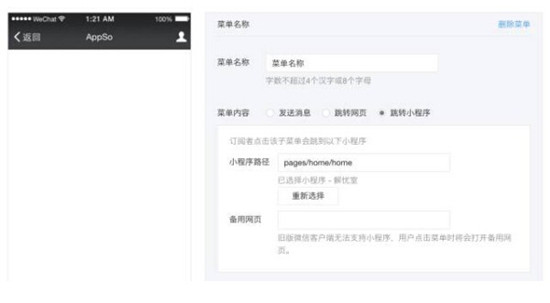 - 公眾號菜單欄允許打開小程序:原有的公眾號粉絲能夠迅速轉化為小程序的用戶。自定義菜單支持打開小程序,將有助于完成「公眾號訂閱者」到「小程序用戶」的身份轉變。