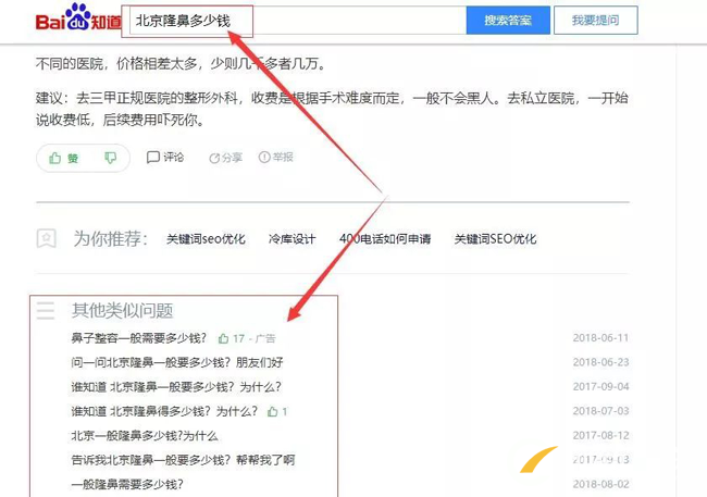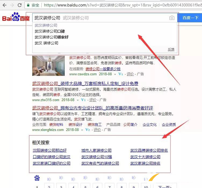 這是“武漢裝修公司”這個詞的百度下拉和百度相關搜索圖,下拉和相關出現的詞都是百度推薦的,和武漢裝修公司最相關的詞,從這些詞中我們可以分析的出,武漢裝修公司這個詞的核心是裝修公司,其次是地區,和裝修材料、裝修效果以及裝修風格沒有任何關系。