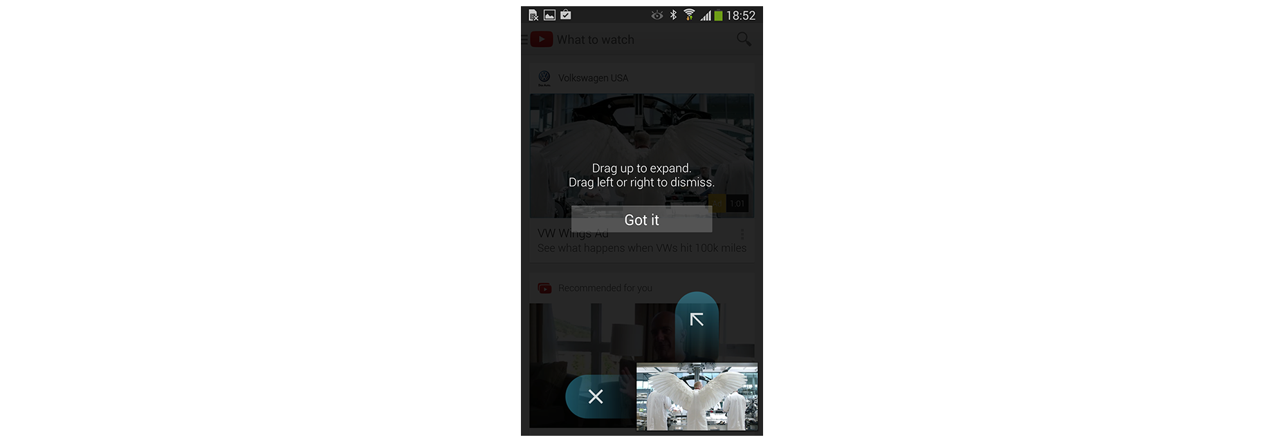 下圖是 Android 版的Youtube 的APP中的手勢交互的引導界面,這款源自谷歌官方的應用采用的是標準的Material Design的手勢交互方式,用戶會在初次進入應用之后,適時地提供相應的手勢交互引導,一次一項,不會進行填鴨式的信息灌輸。簡練的文本引導,讓用戶能夠快速明白交互方式和結果。