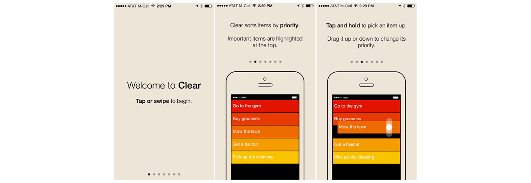 許多手勢交互驅動的APP當中,設計師都習慣于將手勢交互的教程放在首次打開APP的時候。這樣帶有新用戶引導教程的APP非常之多,用戶需要在剛剛進入的時候,了解APP的功能、特點,學習操作等等等等。但是,這樣的教程展現方式本身并不夠優雅,也不夠有效。這種新用戶引導階段的前期教程所存在的主要問題,是用戶必須在一打開應用的時候,就記住一大堆的信息。如果信息和教程不多還好,稍多一些,用戶會很快陷入混亂。舉個例子,著名的效率應用 Clear,新用戶引導教程長達7頁,用戶需要非常耐心地看完它們才知道如何正確有效的使用這款應用。這樣的設計無疑是糟糕的。