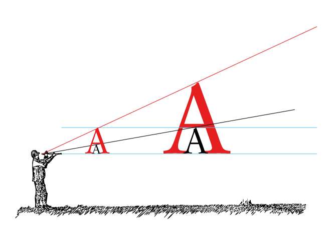 下面的圖案顯示了,當你的正文字體離你的身體越遠,需要的字體更大。兩個黑色的和兩個紅色的A有一樣的度量尺寸。但是因為右邊的一副被拿在更遠的位子,感受到的尺寸會更小。右邊紅色的A和左邊黑色的A在感受上一樣的尺寸: