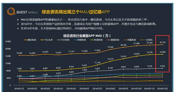 其旗下的產品矩陣為:騰訊新聞+天天快報,但這兩個本身還不是重點,重點是微信和手Q里給了這兩個app新聞插件的入口,并每天都有推送。要知道,微信和手Q的月活都在8億+的級別,這和當年PC QQ用右下角彈窗來帶動其它產品一樣無解。剛剛出來的騰訊2016全年財報里提到: