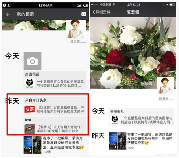同時,騰訊還保留了一種最強的競爭手段。如下圖所示,根據鈦媒體消息,時隔一年后,又有今日頭條鏈接分享到朋友圈后,好友無法看到,但是分享者自己卻可以在自己的主頁看到的現象。