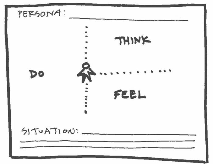 共情圖幫助我們了解其他人的所思、所感。通常情況下,研究筆記是根據研究受訪者在使用產品時所思、所感、所做、所看、所聽的內容來分類。它還能幫助你的團隊從單純專注用戶行為擴展到思考用戶的情感和體驗。我最初從Dave Gray的《游戲風暴:創新、變革&非凡思維訓練》中學習到這一點,后來在Alex Osterwalder的《商業模型的新生代》中有了更深入的了解。
