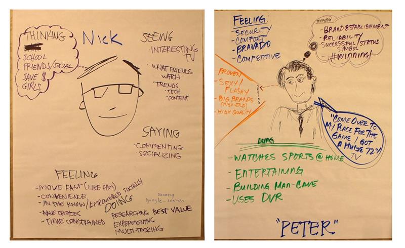 我們對方法進行了一些調整:在和利益相關者一起參與的后期整合工作坊中,聚焦點放在了人物畫像上。我們之所以稱之為用戶共情圖,是由于我們的流程將分類簡化為三大類:所思、所感、所做,目的是為了形成在產品的特定場景下的用戶角色。我們有意將這些場景推向極端(當然,并沒有變的天馬行空)來夸大研究中發現的現有痛點和挑戰。