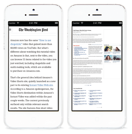 這個問題在手機上有所延伸。對用戶來說在一個小的明亮的屏幕上閱讀是一件很頭疼的事情。比較好的做法是在手機上每行顯示30-40個字符。下面是在智能手機上看到的兩個網站,第一個使用了30-40個字符,而第二個使用了為臺式機設計的網站上的尺寸。
