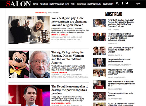 當我們設計的時候,我們可以通過顯示哪些元素是相關的,或不相關的,彼此之間的相似性來傳達組織和關聯。例如,在沙龍的網站上顯示的兩個部分是由他們的相對大小分組。我們清楚地看到兩個獨立的組,上面的故事在左邊,大多數在右邊讀。