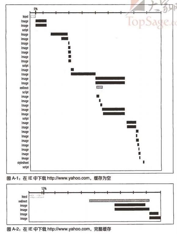 圖A-2展示了在IE中第二次下載同一個(gè)URL的情況。HTML文檔只占了總響應(yīng)時(shí)間的 12%。很多組件無需下載,因?yàn)樗鼈円呀?jīng)存在于瀏覽器的緩存中了。