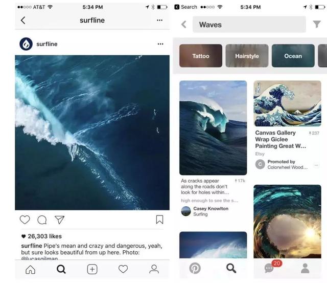 Instagram (下圖中的左邊) 核心功能是希望用戶(hù)上傳照片/視頻;Pinterest (下圖中的右邊) 的核心功能是發(fā)現(xiàn)和搜索靈感圖片,所以把搜索放在了頂部最顯著的位置。