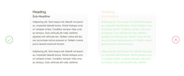 背景與內(nèi)容之間的對(duì)比度應(yīng)該足夠適合閱讀,以免引起眼睛疲勞。通常,白色背景下的黑色文本是最容易讀的,盡量不要用淺灰色,黃色和綠色的文字。如果你自己做完設(shè)計(jì)稿,不得不瞇著眼睛才能看清,那就肯定是有問(wèn)題了。