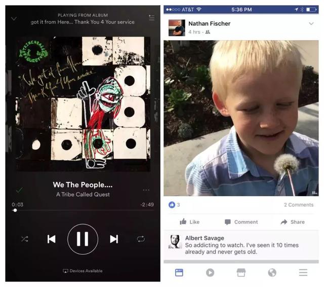 Spotify (下面的左圖) 希望給音樂(lè)專(zhuān)輯更多的曝光,所以將播放頁(yè)面中的專(zhuān)輯封面放到大,將播放器控件放在第二重要位置;然后在第二重要的播放器控件中再進(jìn)行重要級(jí)拆分,結(jié)合用戶(hù)的實(shí)際需求頻率,把播放和暫停放大,快進(jìn)和快退縮小。