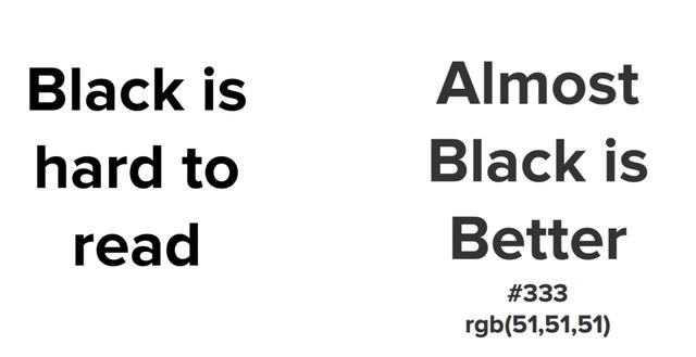 如果可以選擇,推薦使用#333333 RGB(51,51,51)而不是純黑色作為文字內(nèi)容。純黑色配上白色背景會(huì)讓眼睛產(chǎn)生視覺(jué)抖動(dòng),讓文字難以聚焦。