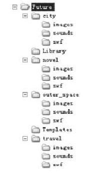 其中,Future為站 點的根文件夾,在根文件夾下根據網站不同的主題可分為“未來都市”、未來旅游(travel))、未來太空(outerspace)、科幻小說(novel)等等欄目,每個欄目分別對應不同的內容。而每個主題所有文件均放在文件夾中,然后再進一步地細分文件類型