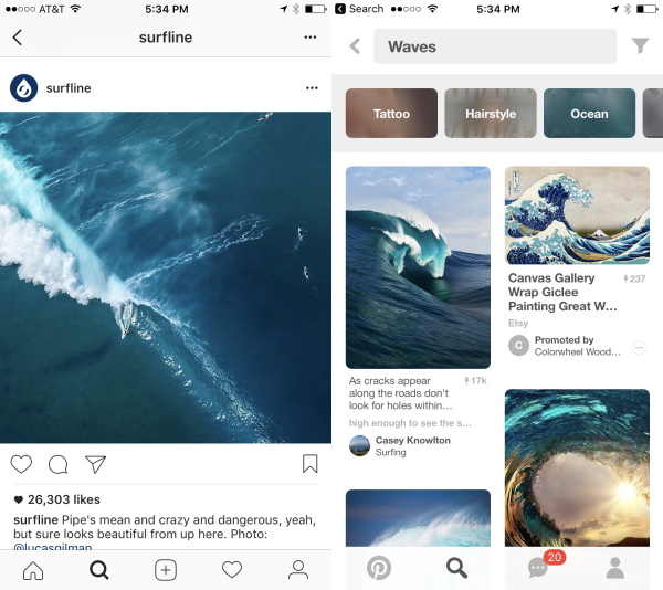 Pinterest(下圖右側)的主要功能是搜索,人們在上面瀏覽翻找信息。