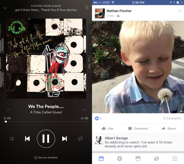 Spotify(下圖左側)顯然把唱片封面和音樂標題放在第一位,將用戶操作放在第二位。盡管操作是第二位,Spotify仍然保證播放暫停按鈕的比重大于前進后退。