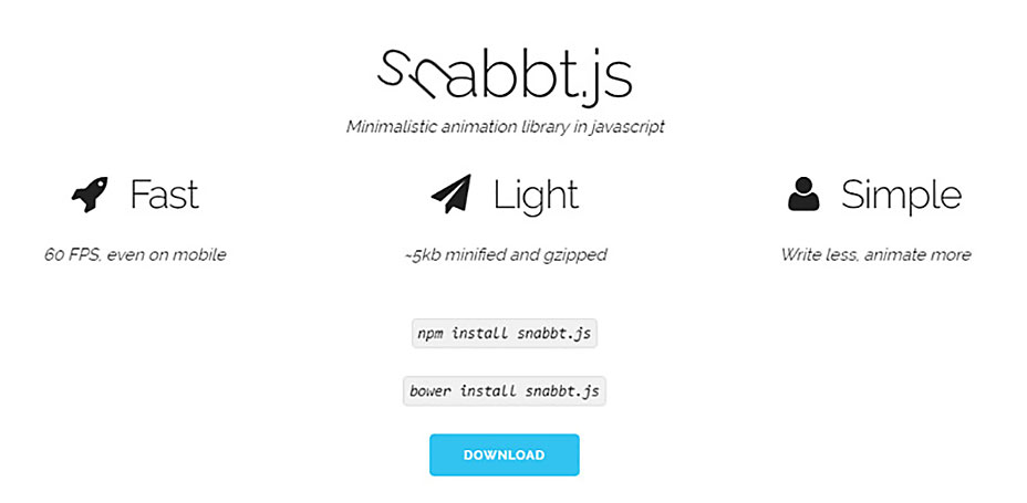 Snabbt.js 在創造動效這件事上,一直是以輕量和極簡而著稱的。它只有5kb 的大小,但是它能搞定平移、旋轉、傾斜、縮放等常見的動效效果,非常高效。