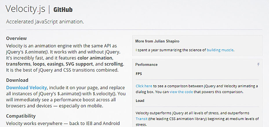 Velocity.js 也同樣是一個動效引擎,乍一看可能沒啥太過突出的地方,然而它囊括了絕大多數常見的動效,比如變形、循環、滾動等,它足夠快速,且不依賴 jQuery。