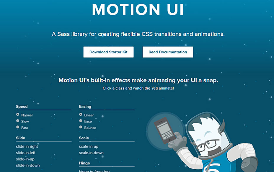 Motion UI 和前面的工具都不一樣,它是借助SASS 來創建有趣的CSS動效。其中包含了一整套預定義的特效,可以運用到不同的HTML組件當中去。除了IE9,其他瀏覽器都可用。