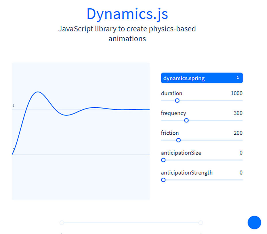 Dynamics.js 是一個JS庫,能為你提供9種標準的動效,你可以制定其中的持續時間、頻率、預期尺寸和強度等數據,創造出符合物理效果的動效。