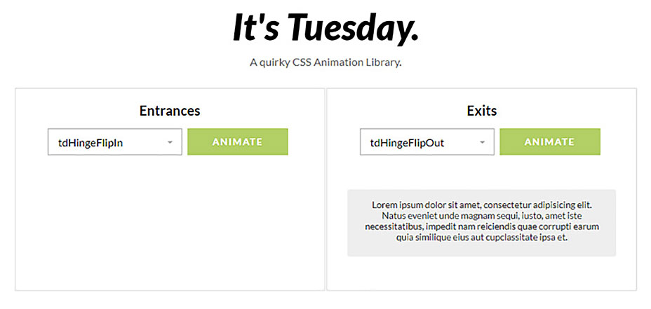 Tuesday 是一款獨立的動效庫,可以和其他的庫一起搭配使用,其中的動效大多以流暢和優雅著稱,淡入淡出,擴展,收縮效果均是如此。