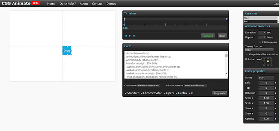 你可以使用 CSS Animate 作為測試和生成動效代碼的游樂場,任何常規動效都可以在這里幫你測試,設置好名稱、類、動效屬性、框架屬性以及時間軸和標記之后,最終能夠生成你想要的代碼和動效。