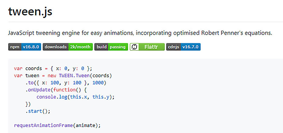 TWEEN.JS 是目前最強大的動效補間引擎,其中的參數控制系統足夠完善,讓你擁有好的動效解決方案。