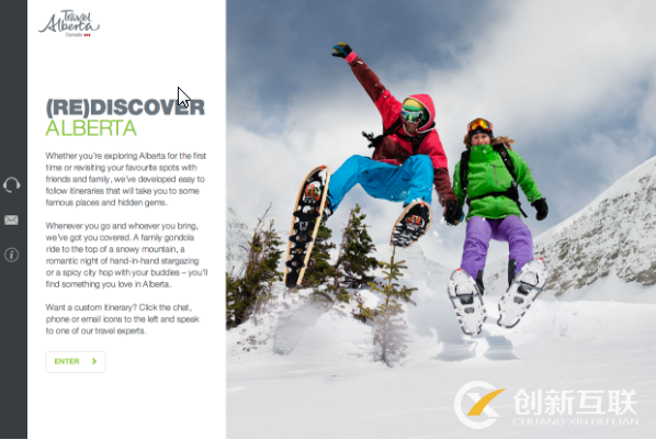 這個(gè)加拿大旅游策劃網(wǎng)站中每一張圖片都有其價(jià)值。艾伯塔省旅游局的網(wǎng)站上有大量的關(guān)于加拿大西部省份的旅游信息。如果你只是想計(jì)劃一個(gè)行程單,這個(gè)優(yōu)雅的小型網(wǎng)站,會(huì)使該任務(wù)變得快速和簡單。而當(dāng)你點(diǎn)擊通過過程的每一個(gè)階段,有一些可愛的幻燈片過渡,使之成為愉快的經(jīng)歷。在你的