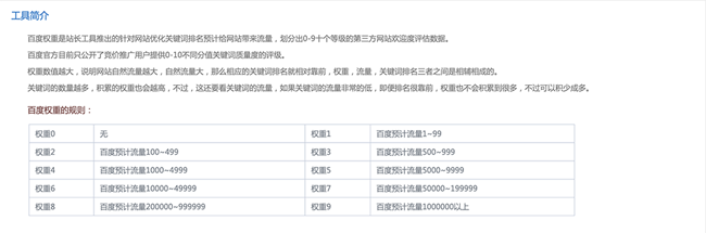 權重的等級是從1~9,chinaz站長工具給出的計算公式是通過預估流量達到多少而定,例如你的預估流量是100那么網站權重就是2,低于100的則是1。