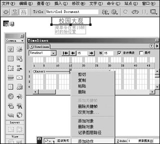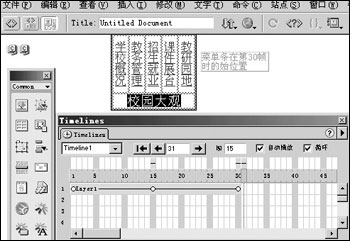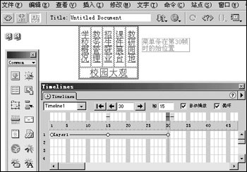 1、選定層面,當鼠標變成十字形時按住左鍵將層面拖動到頁面右上角(使整個菜單條完全露出但上邊緣正好靠攏頁面上邊界),在窗口菜單中打開時間線面板,選定層面將其拖動到時間線上,Dreamweaer會自動產生一個長度為15幀的動畫對象,拖動該動畫對象的最后一個關鍵幀到第30幀,將其長度設置為30幀。然后在第15幀處單擊右鍵,在彈出的快捷菜單中選擇添加關鍵幀選項插入一個關鍵幀,并將層面拖動到適當位置(如圖2)。在時間線窗口中的第15幀處再次單擊右鍵,在彈出的快捷菜單中選擇添加動作,為該幀添加一個交互行為,Dreamweaer將自動打開行為面板。單擊行為面板中的+按鈕,從彈出的菜單中選擇Timeline/Stop Timeline,打開Stop Timeline對話框,選擇Timeline1后單擊確定按鈕關閉該對話框。交互行為的事件為onFrame15,動作為Stop Timeline,這樣當時間線運行到第15幀時,動畫將停止播放,這樣就實現了菜單條彈回的功能。