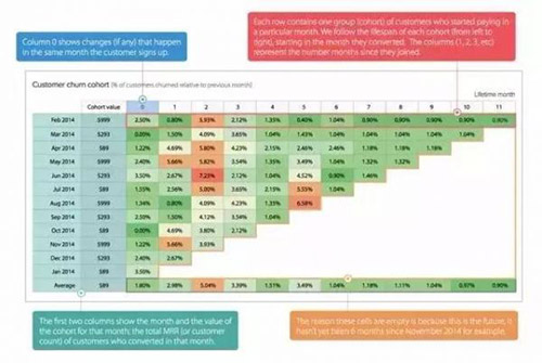 另外,我們能從所有客戶的集體生命周期的走勢(shì)中獲得很重要的信息。比如說(shuō)在上圖中你能看到在第五個(gè)月(帶有數(shù)字5的那一豎排)時(shí),客戶流失一直朝著更高水平發(fā)展,從中你就能知曉客戶在第五個(gè)月是很容易流失的。