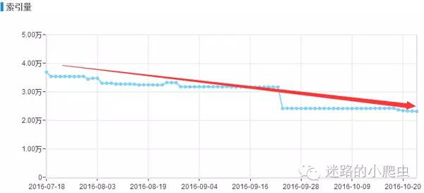 如上圖小編是今年三月份開始接手的這個網站項目,當時并沒有通過逆向思維去解決網站存在的收錄問題,只是經驗性的簡單分析了一下網站的日志,在站長后臺增加了sitemap推送和在服務器上部署了主動推送功能,短時間內的確效果明顯,該頻道的頁面收錄呈現良好的上升趨勢,可是通過圖表可以看出,收錄量在達到6月份的時候一直到7月份中旬沒有進行任何明顯的變化,從7月中旬之后小編當時就有一種危機感,職業上的直覺告訴我,接下來一段時間該頻道的收錄會呈現大幅下降的趨勢,結果果不其然,如下圖:
