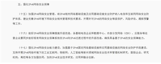 在關于IPv6規模部署的行動計劃中,網絡安全提升是其中的重要任務。《通知》明確要求從網絡安全管理、網絡安全保障措施升級改造、網絡安全能力建設三個方面強化IPv6網絡安全保障: