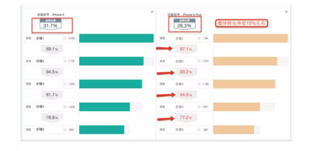 比如說用戶最終對于某一些機型的購買結算的按鈕,他在點擊的時候可能點擊不太動,點擊幾次以后,這個用戶可能就會煩燥。煩燥了以后,他可能就不愿意去完成購買了。所以,平時這種交互的體驗,和我們的這種可用性也是一個非常大的問題。如果某個瀏覽器、某個手機機型轉化率低,那就要注意是否存在設備的適配性問題。