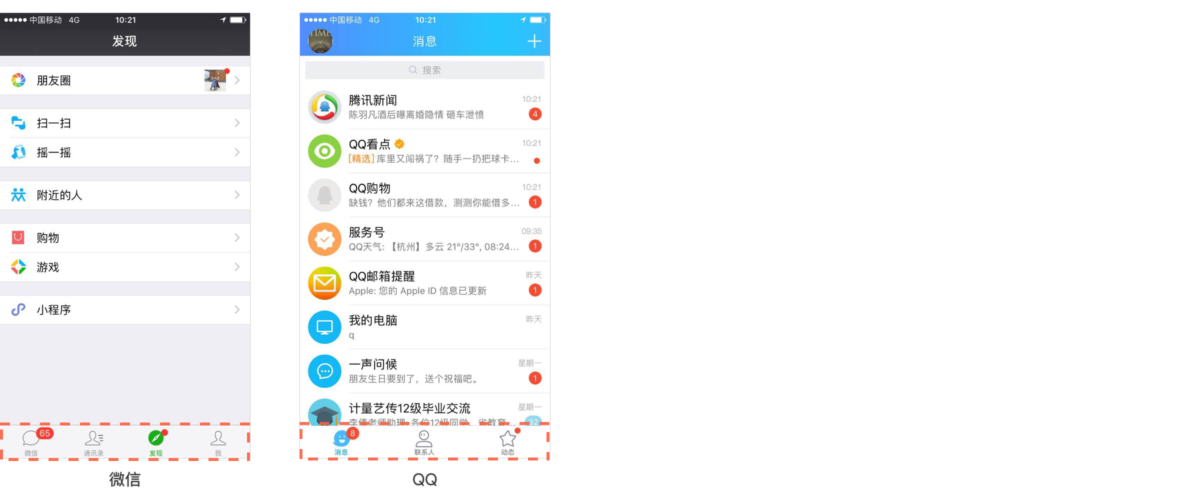 如下圖所示,微信、QQ等常見應用均使用底部tab導航。