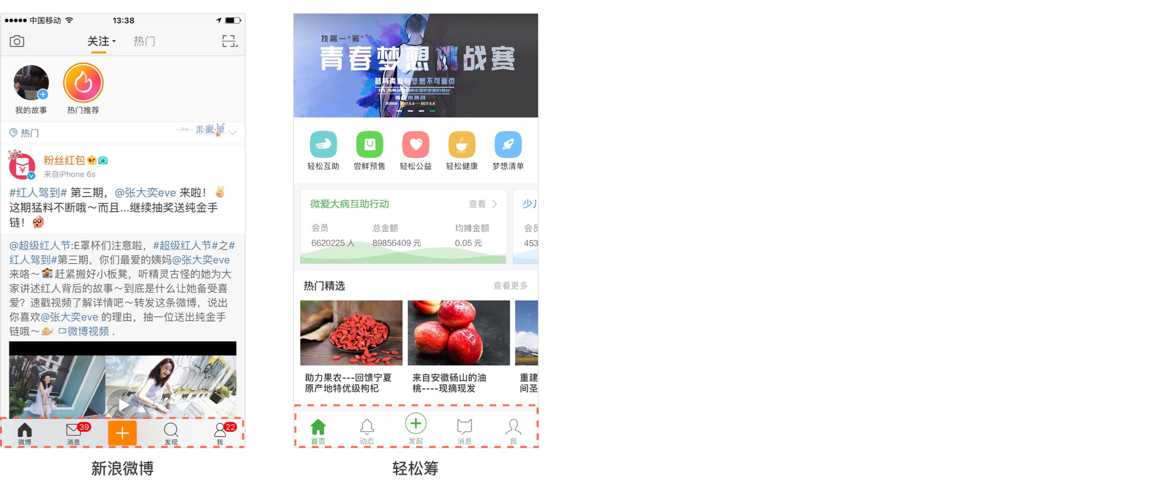 如下圖所示,新浪微博標簽欄中間的發(fā)布按鈕,輕松籌標簽欄中間的發(fā)起籌款的按鈕。