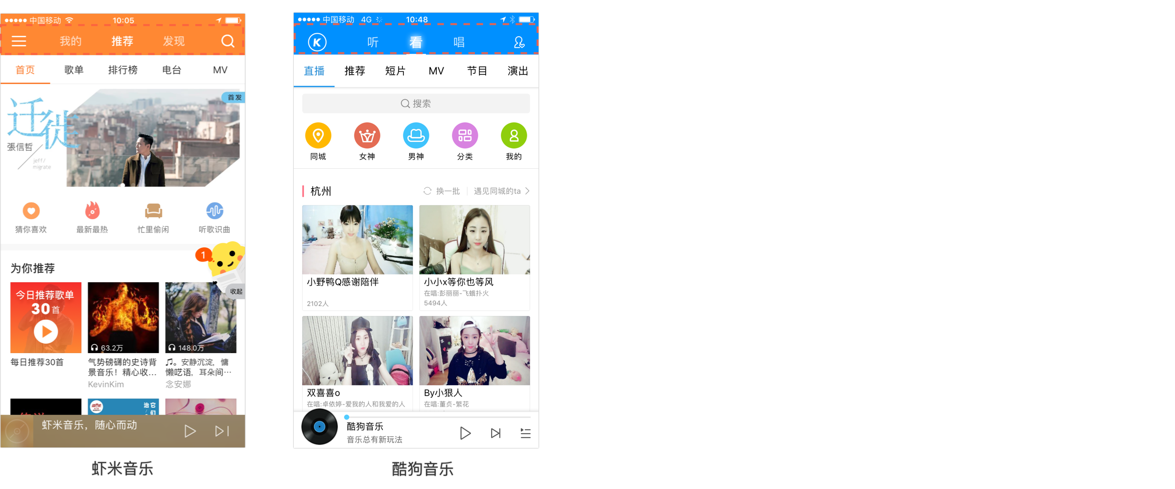 4.1如下圖所示蝦米音樂、酷狗音樂,當內(nèi)容分類比較多的時候,且某項功能必須固定在底部,那么選項卡固定在頂部,作為主導航。主導航下方為次級導航,即該選項卡下多個子視圖分類(下圖中,音樂播放功能固定在底部)。