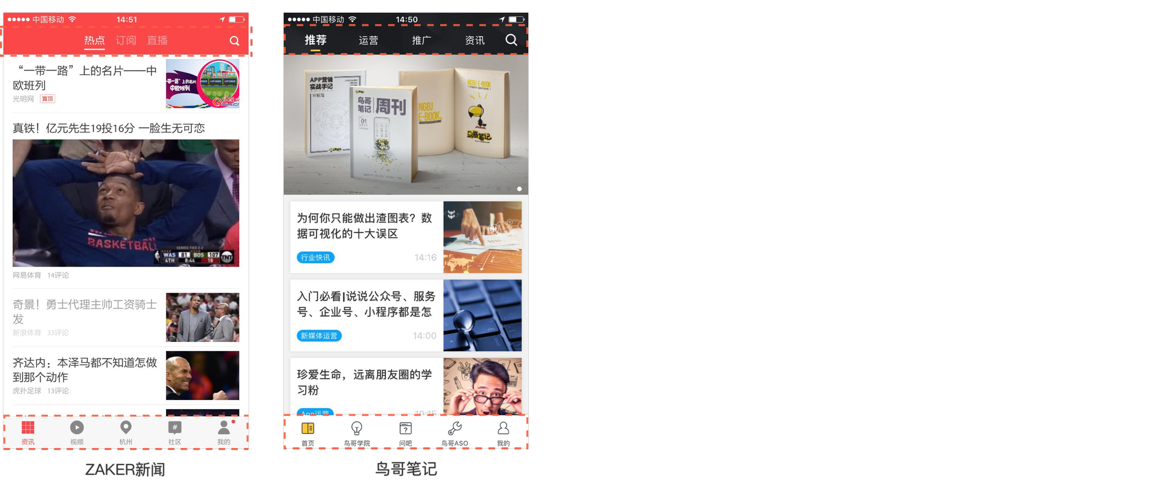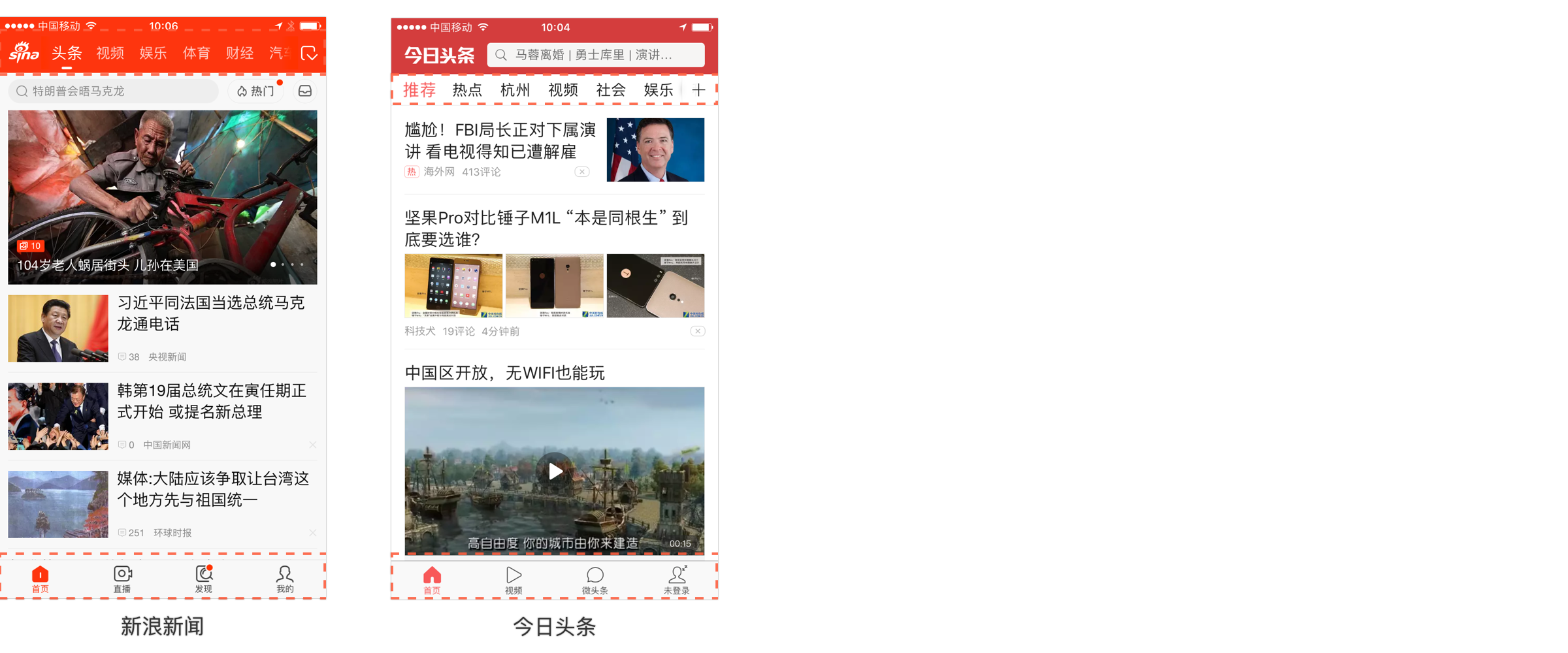 如下圖新浪新聞、今日頭條,底部tab做主導航、滾動選項卡做為次級導航組合使用。