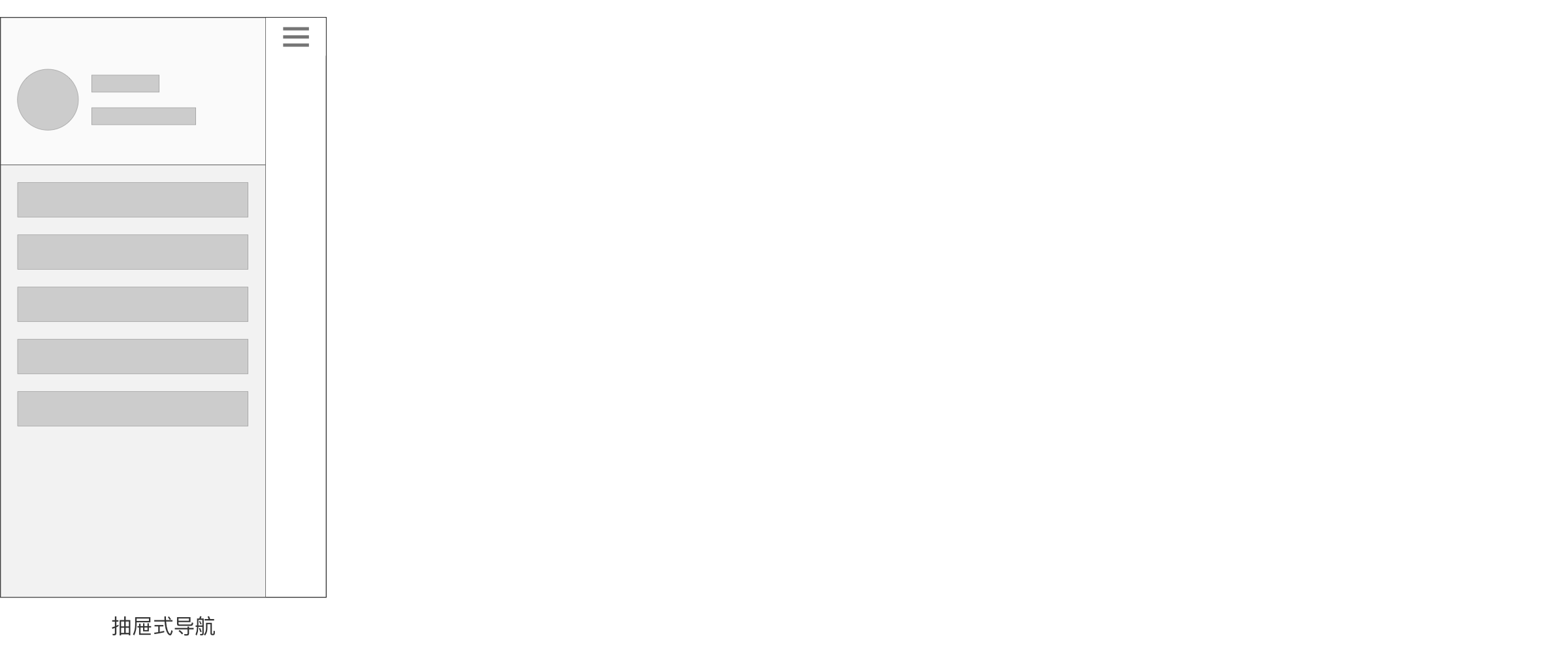 抽屜式導航又稱側(cè)邊(抽屜) 式導航,是一種瞬時的導航方式,即只有在我們需要的時候才會顯示出來(通過點擊調(diào)出),在我們做出選擇后,再次消失。