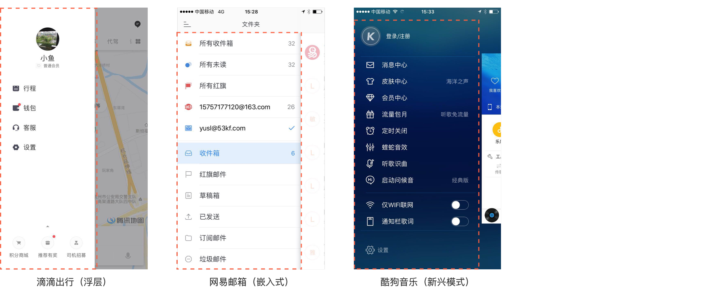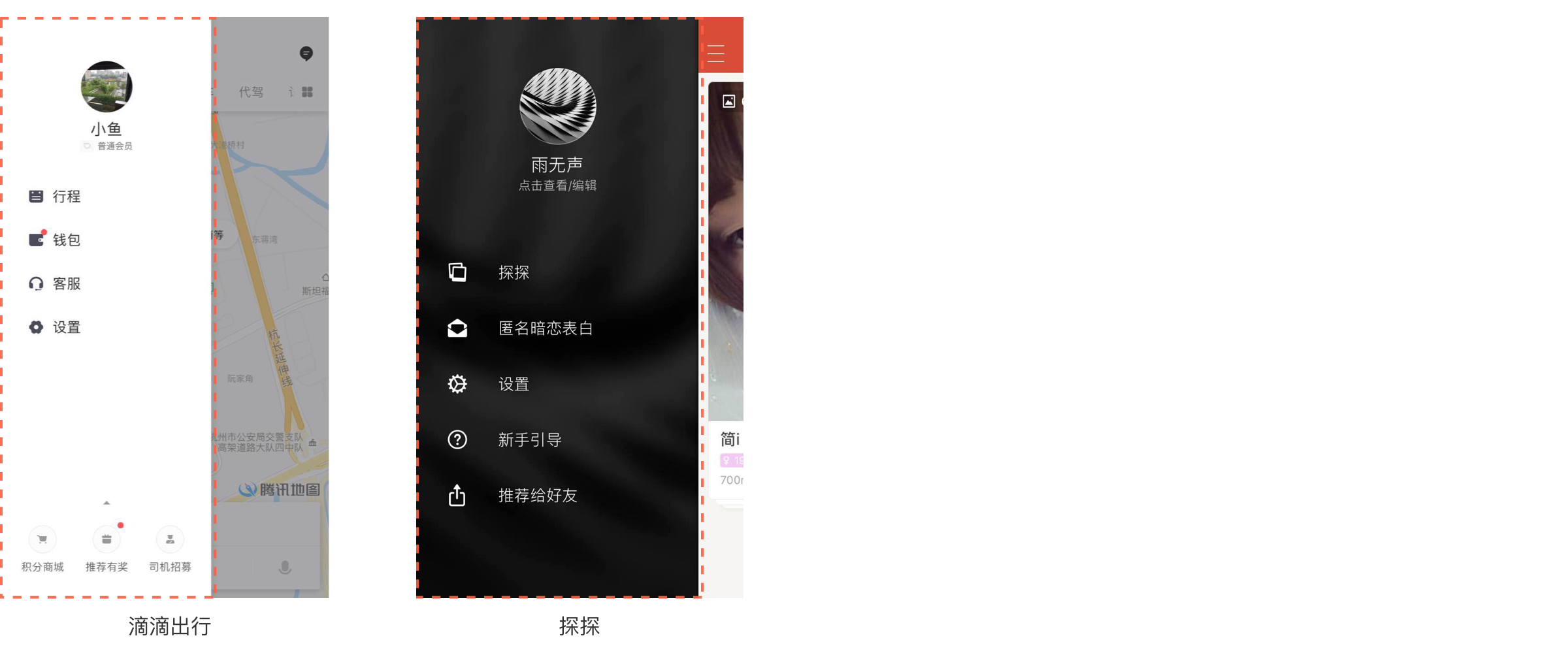 7.1當應用的核心功能流程單一,主界面就能滿足用戶核心場景下的需求,不需要頻繁在幾個功能模塊之間進行切換,即可將其他的功能模塊(通常是分類、設置、個人中心等)做一個收納,利用抽屜導航隱藏起來。如下圖所示:滴滴出行、探探。